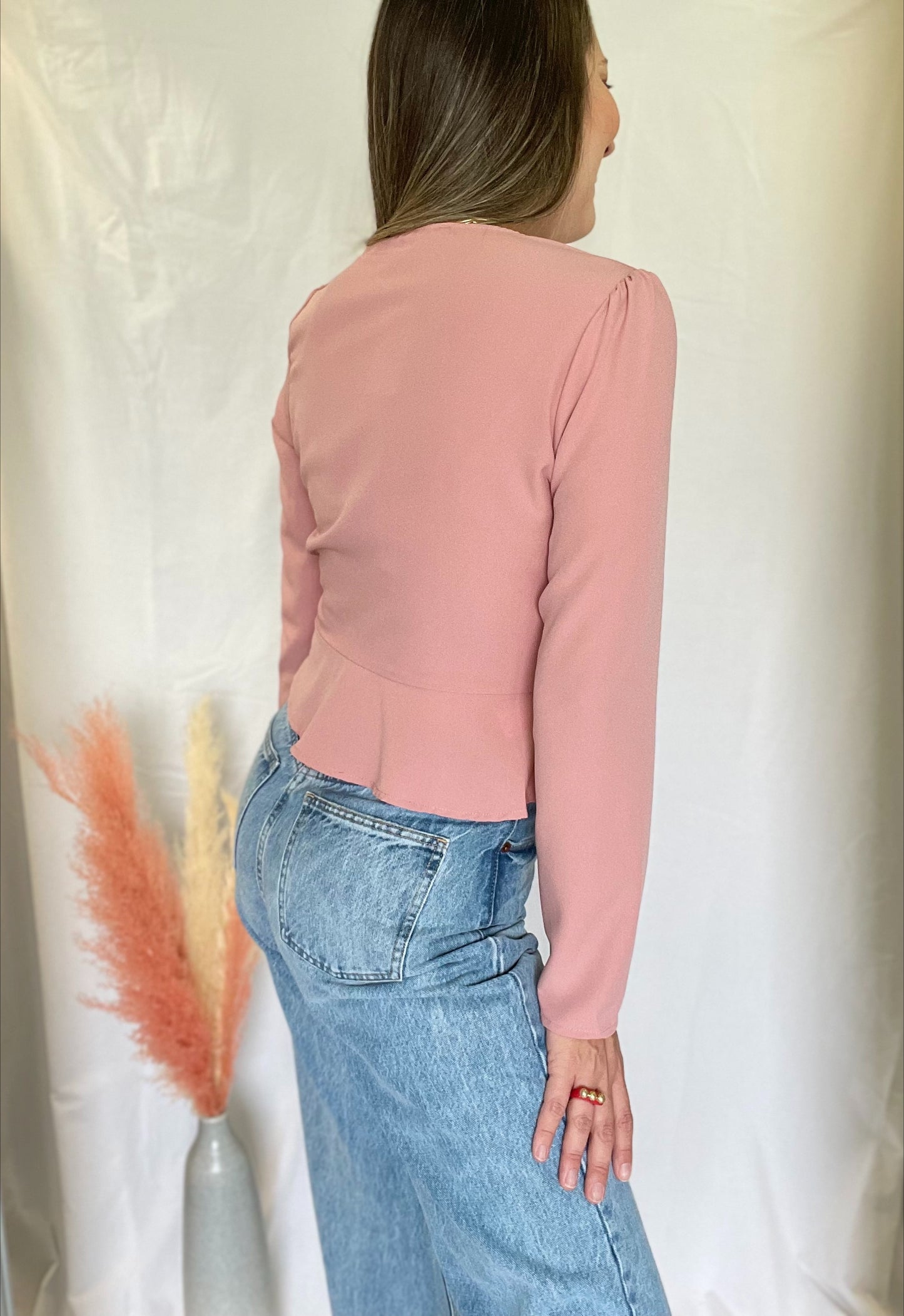 Size Scale: S-M-L - Long sleeve V-neck ruched detail frill hem high-low top.